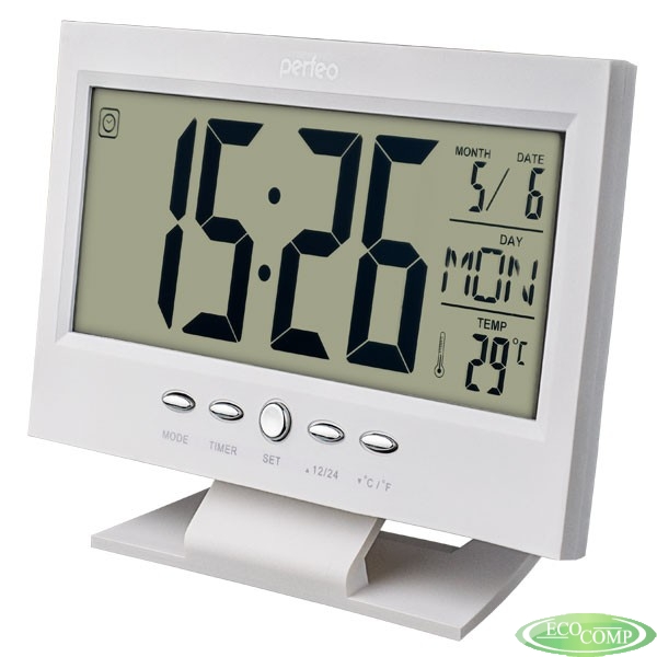 На монохромном дисплее одновременно отображаются два времени, дата, день недели и температура. Встроенный будильник имеет функцию повтора. Можно выбрать из восьми мелодий будильника. Функция таймера. Включение подсветки дисплея хлопком
